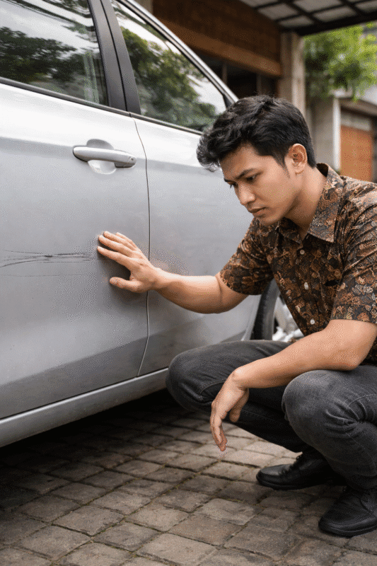 Banyak pemilik mobil (terutama Bapak-bapak atau Ibu-ibu yang sibuk antar jemput sekolah) membiarkan baret ini berbulan-bulan. Hati-hati! 🌧️
