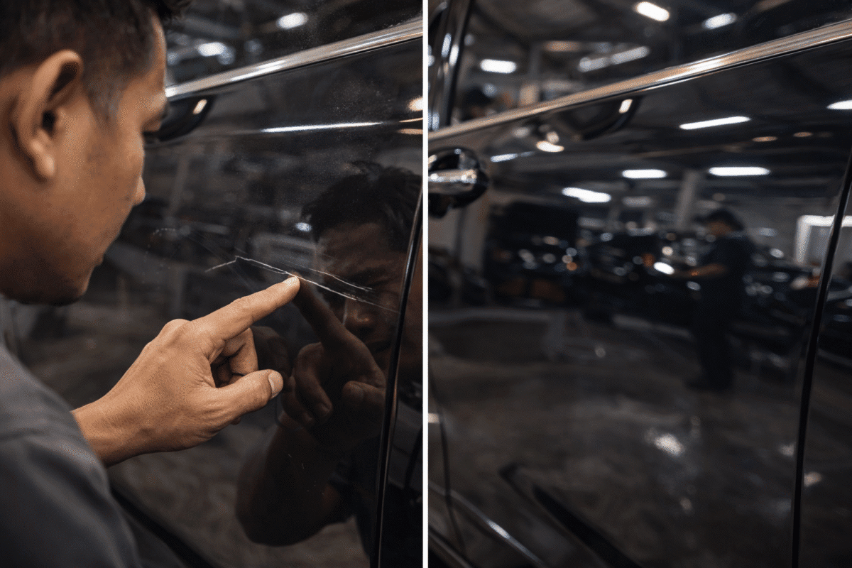 Jika baret mobil Anda masuk dalam Skenario A, kami akan menyarankan layanan Poles Mobil (Auto Detailing).