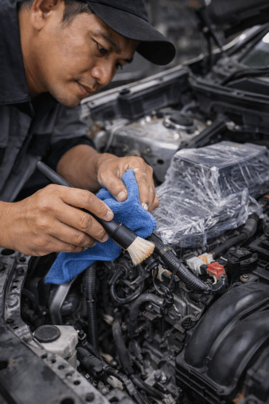 Kami mengaplikasikan Engine Dressing berbahan dasar air (Water-based). Dressing ini bukan silikon murahan yang lengket dan bikin debu gampang nempel. Hasil akhirnya adalah tampilan Satin Look (hitam pekat, natural, dan tidak berminyak saat disentuh). Mesin akan terlihat persis seperti saat mobil pertama kali keluar dari dealer!